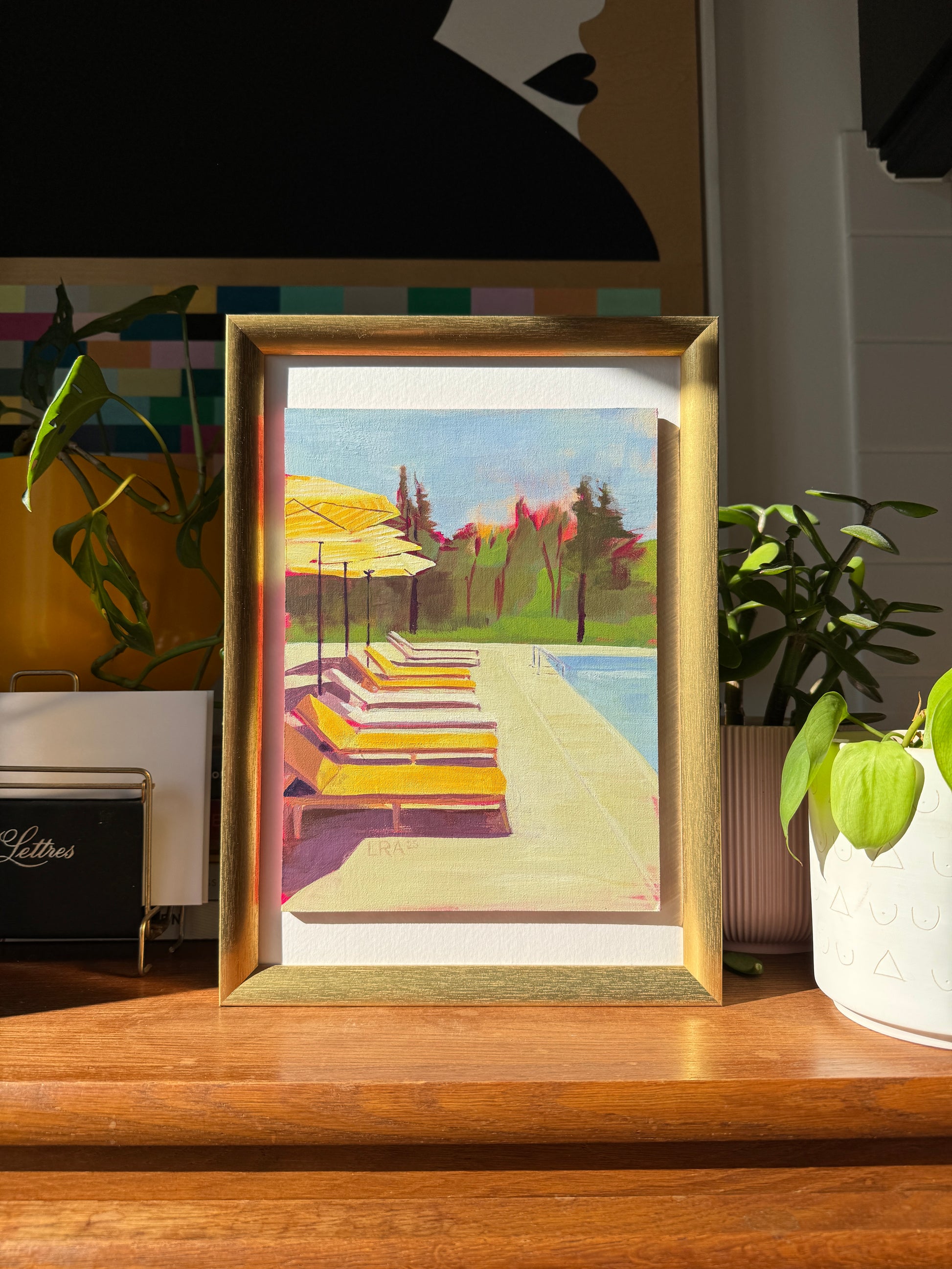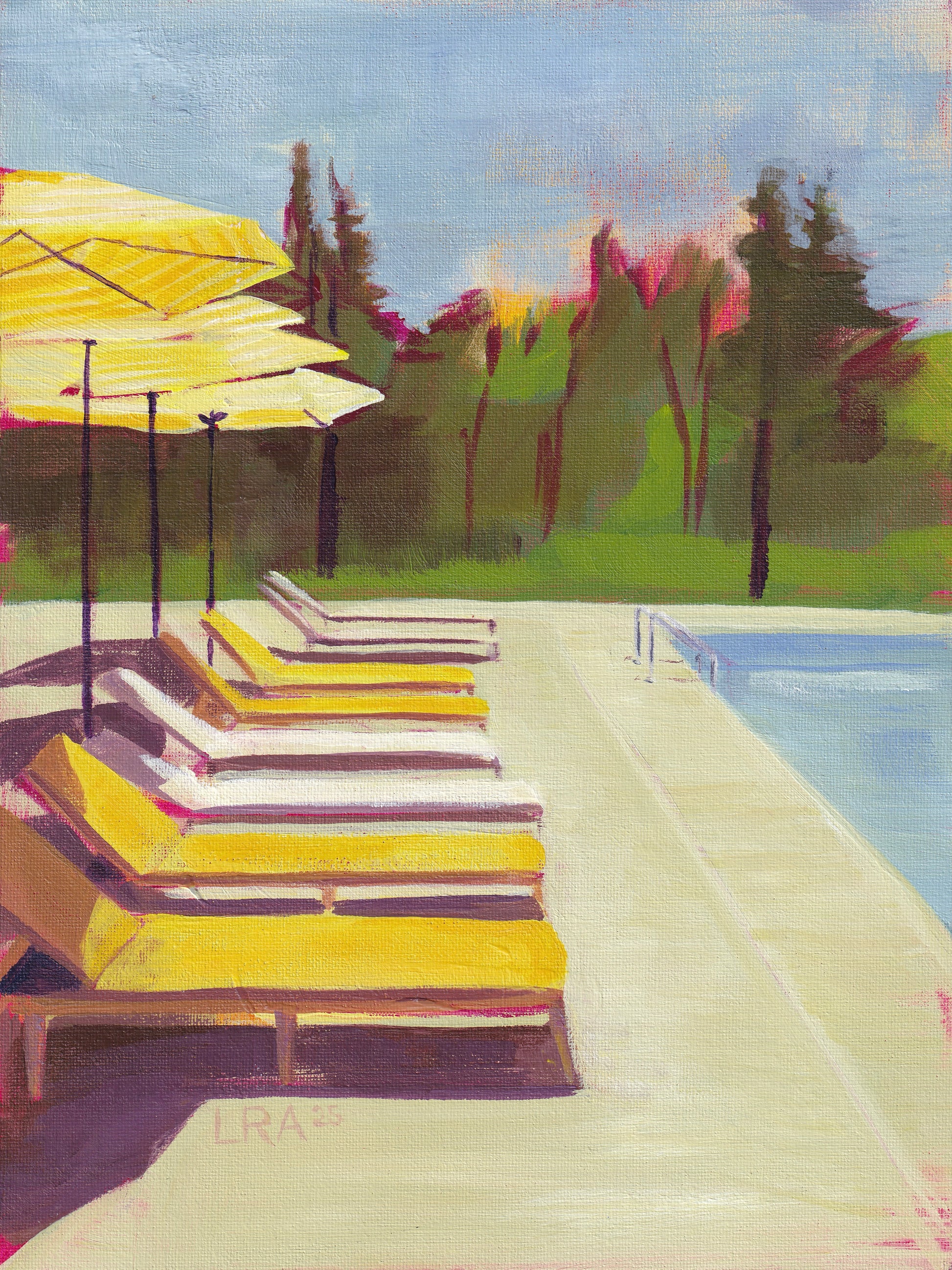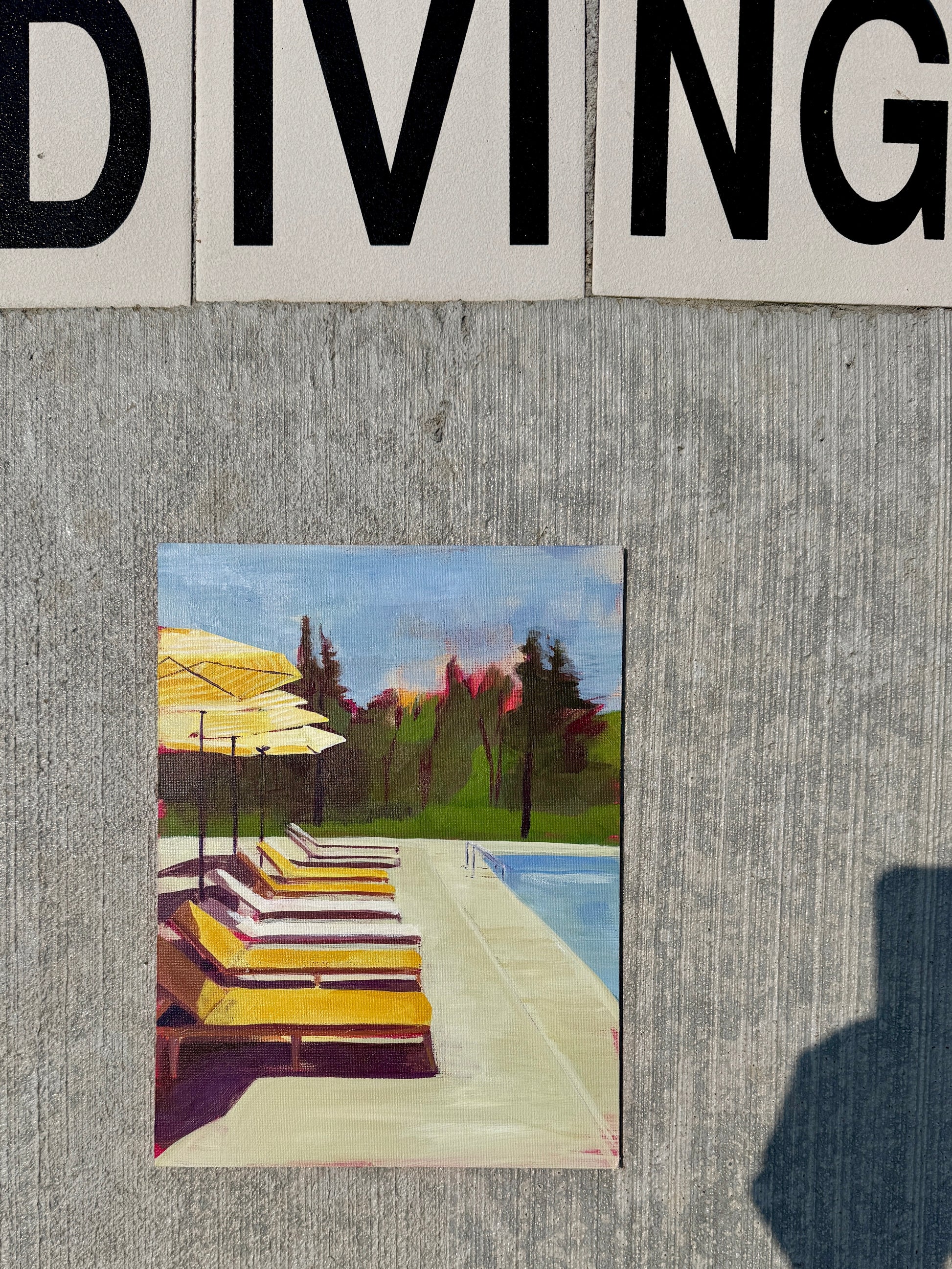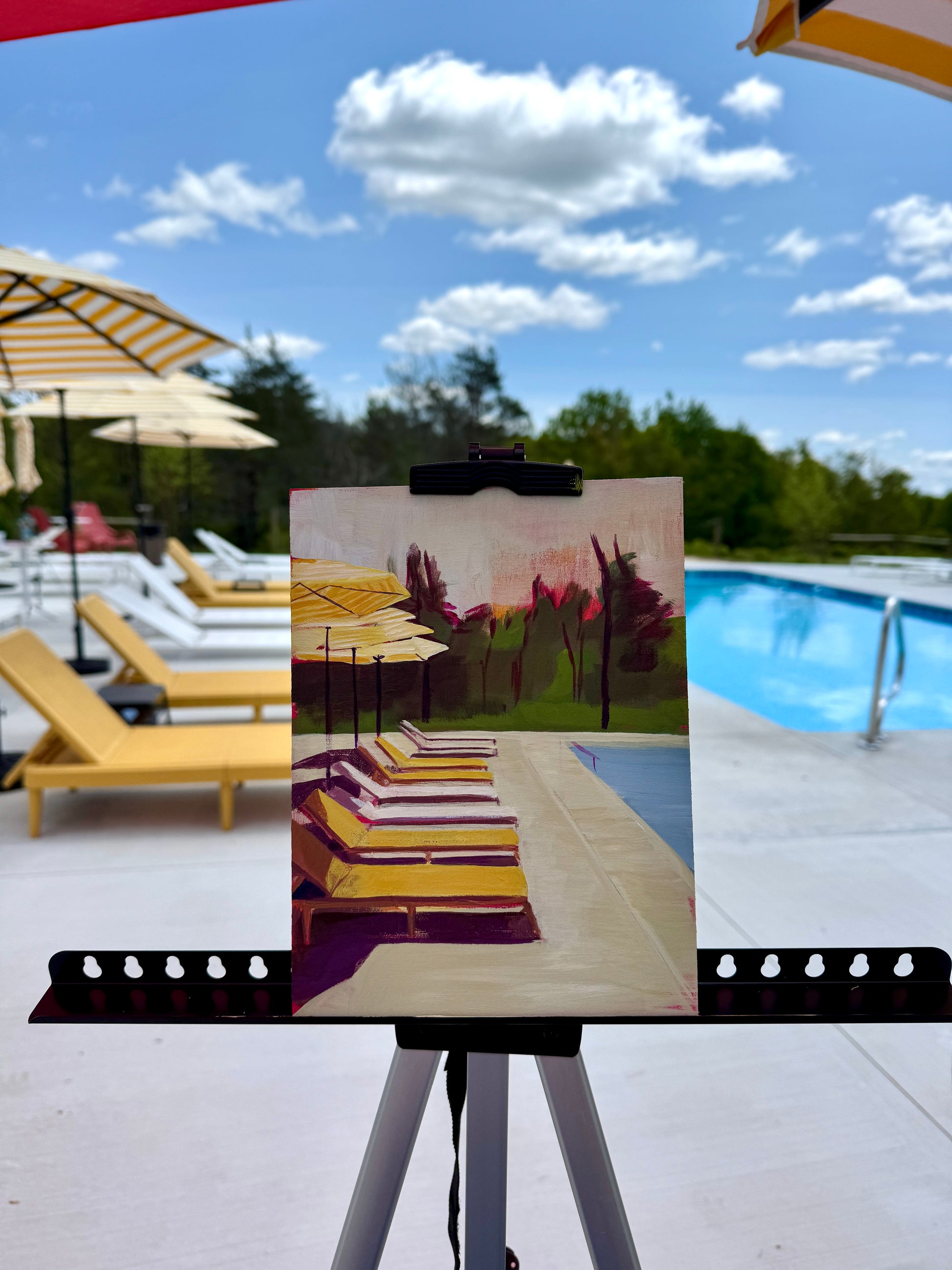 I painted this piece plein-air (from life) at a painting retreat in the Catskills. I woke up early to get some poolside painting in and enjoy the early summer light. This painting has such a moody quality, I often think it would make a good cover for a mystery novel.