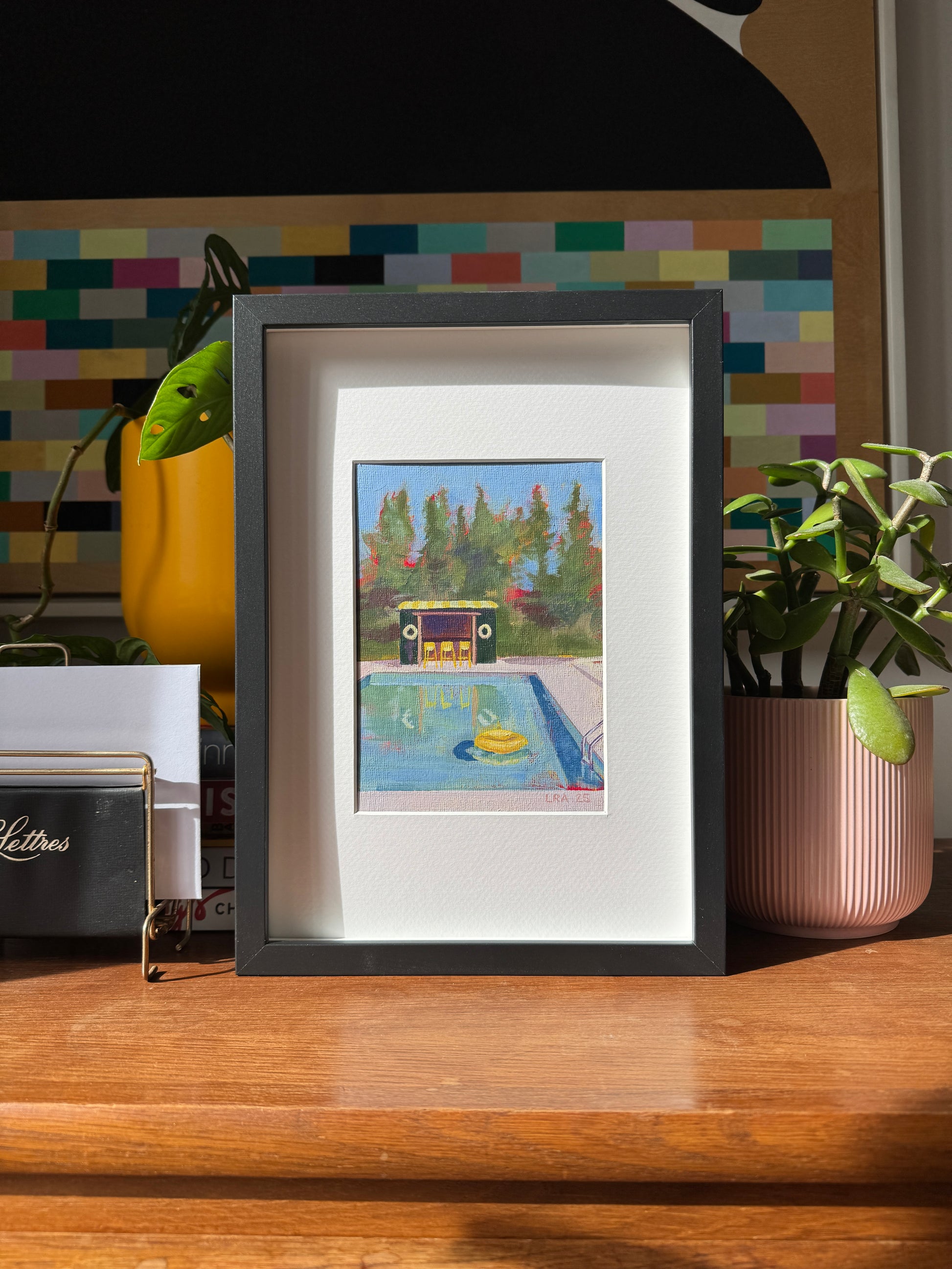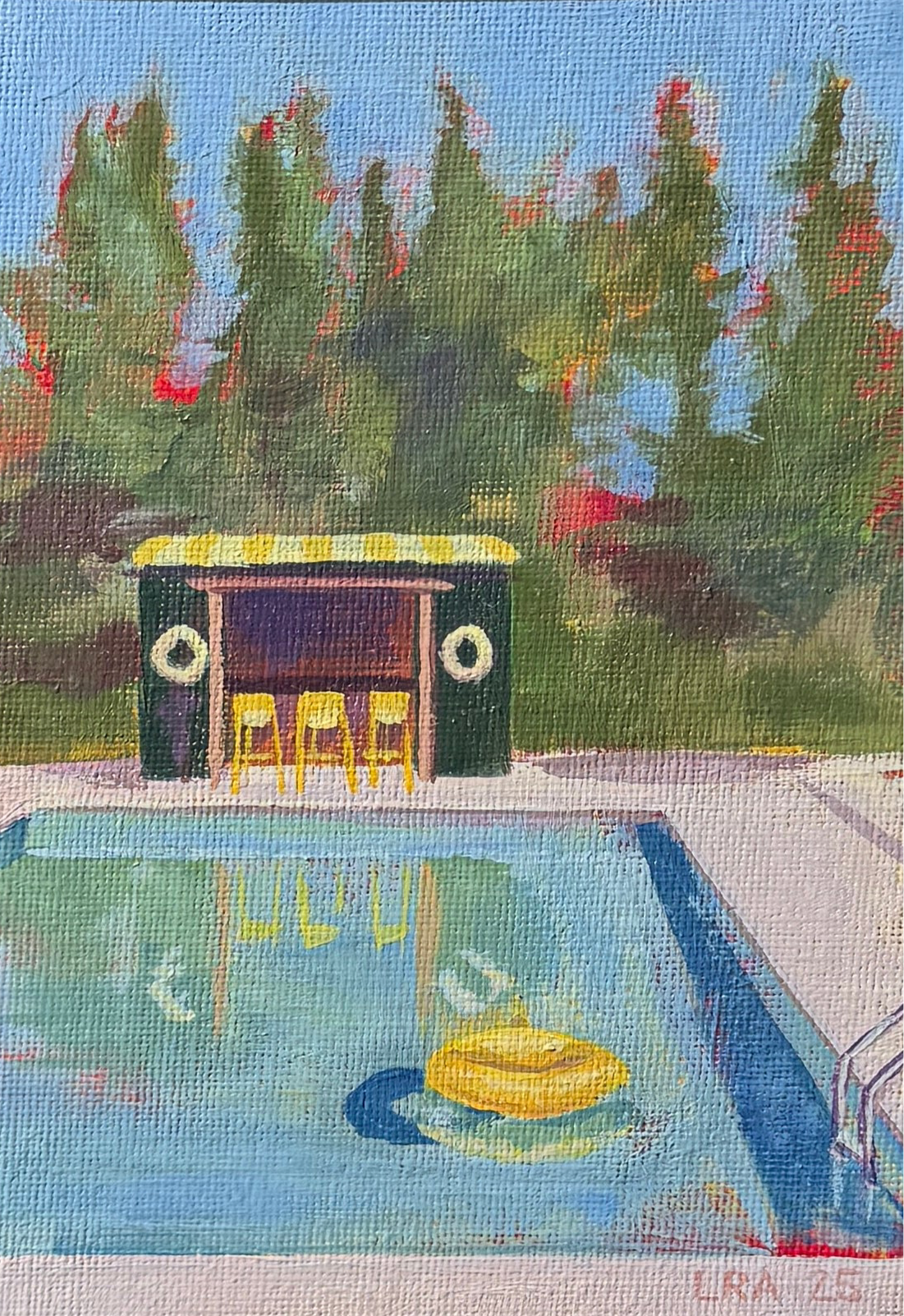 This is the third in a trio of paintings I did plein-air (from life) at a painting retreat in the Catskills. I loved the yellow and white accents and the way the trees loomed over the pool. Painting pools is a favorite practice of mine, I find the faint reflections and movement of the water the perfect challenge.