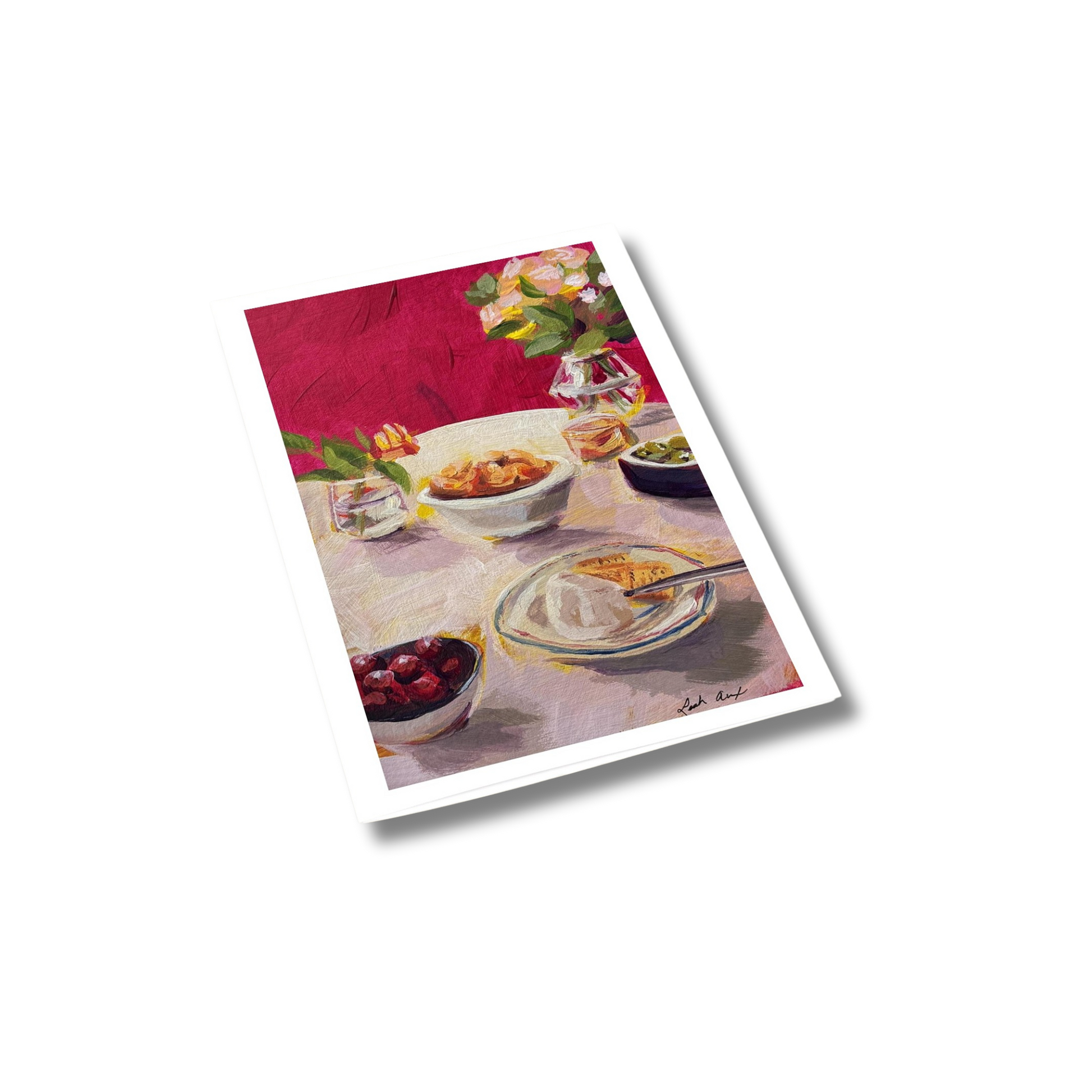 The dinner party series is popular for a reason: it emanates the coziness you feel around the table with friends and good food. Hummus, cheese, olives and fresh flowers set the table to welcome a friend to her new home.