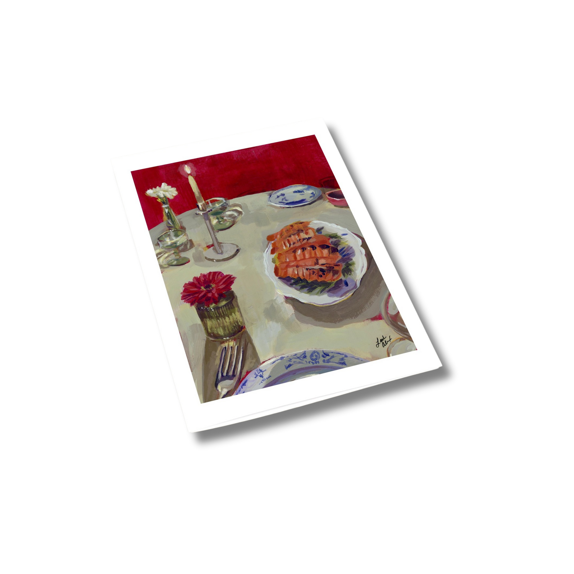The dinner party series is popular for a reason: it emanates the coziness you feel around the table with friends and good food. Lobster tails stand at the ready on a lux tablescape and the solitary taper candle warms the scene.