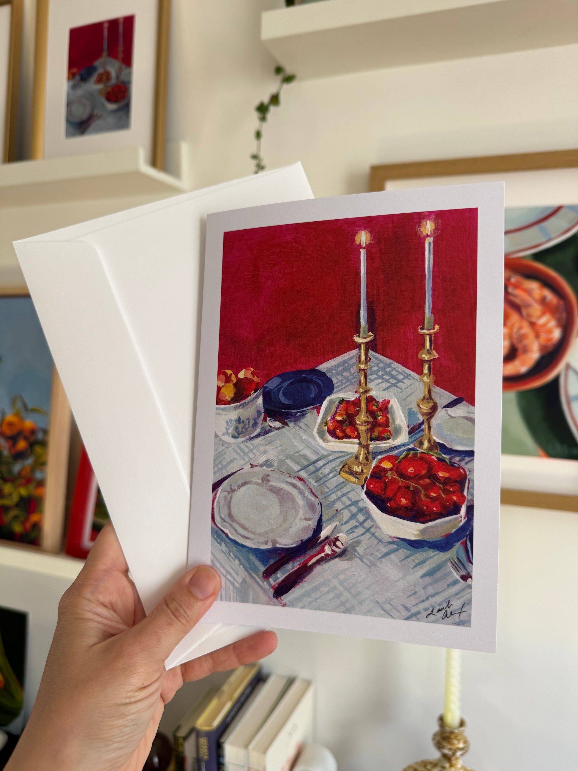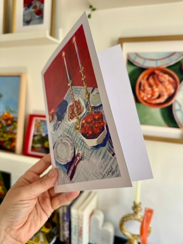 The dinner party series is popular for a reason: it emanates the coziness you feel around the table with friends and good food. The third in the series, this one features a bountiful summer garden harvest on a country checkered cloth. The brass candlesticks are the feature!