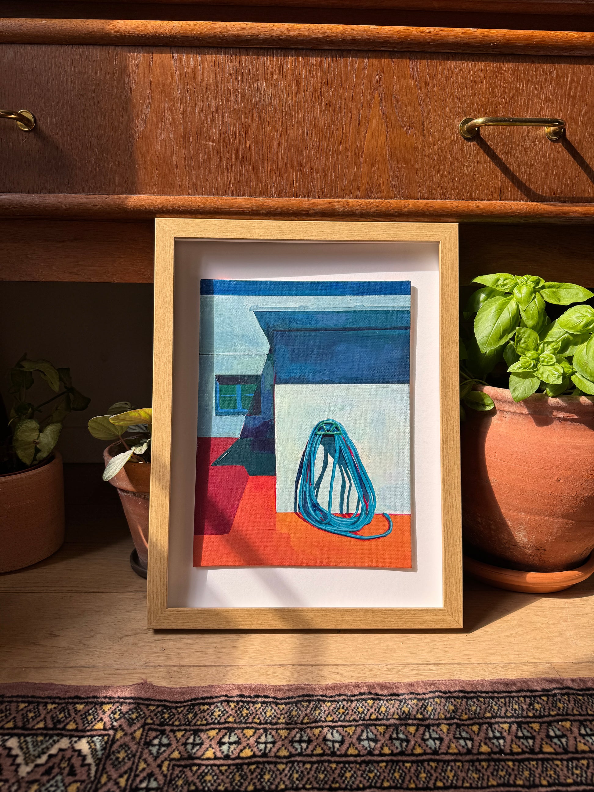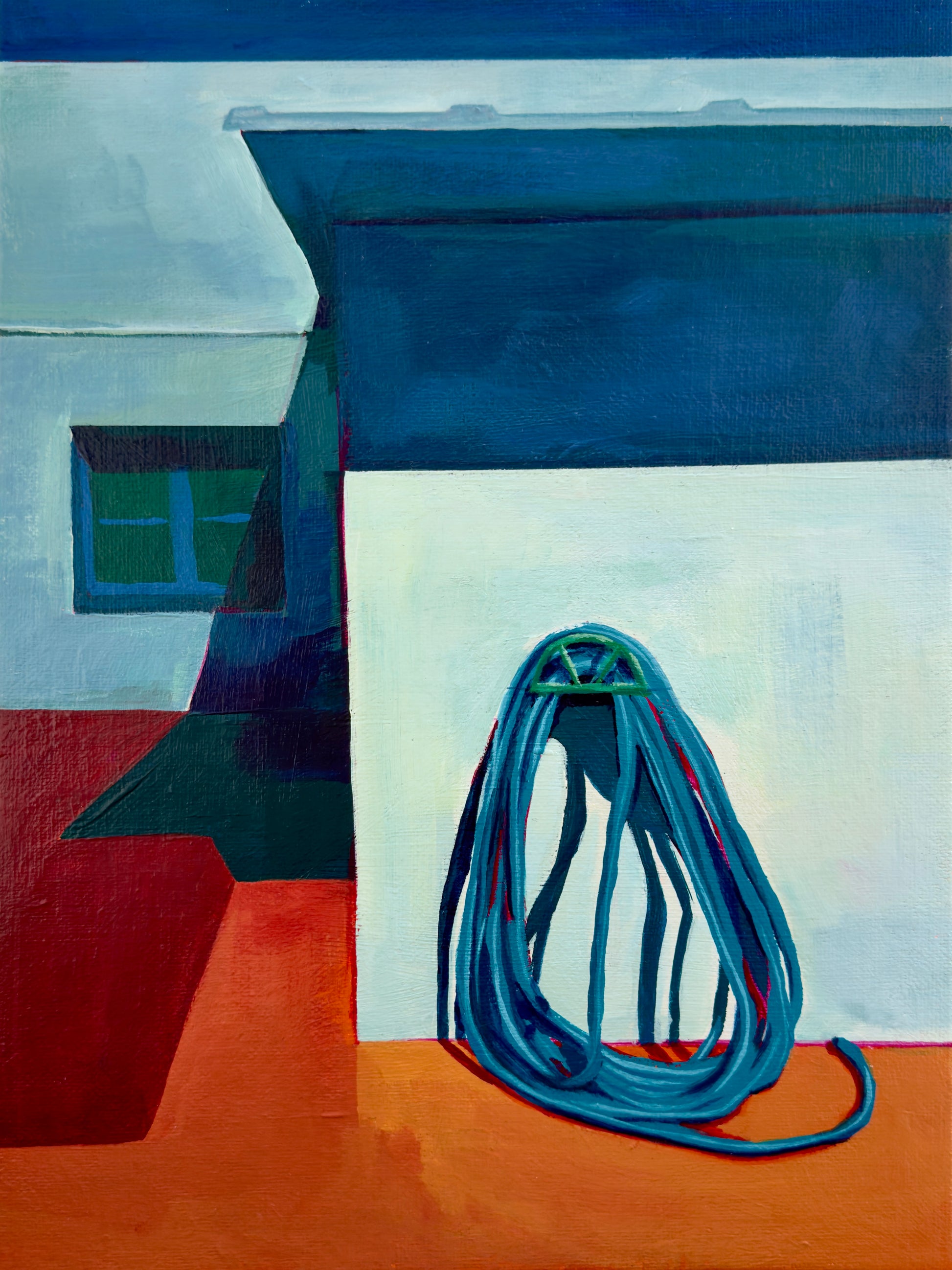 I love sun and shadows, and this simple garden hose turned into such a fun geometric puzzle in the right light. Spain has that in abundance, and I completed this piece on a painting retreat abundant with inspiration. I used a limited palette of just 4 colors for this painting.