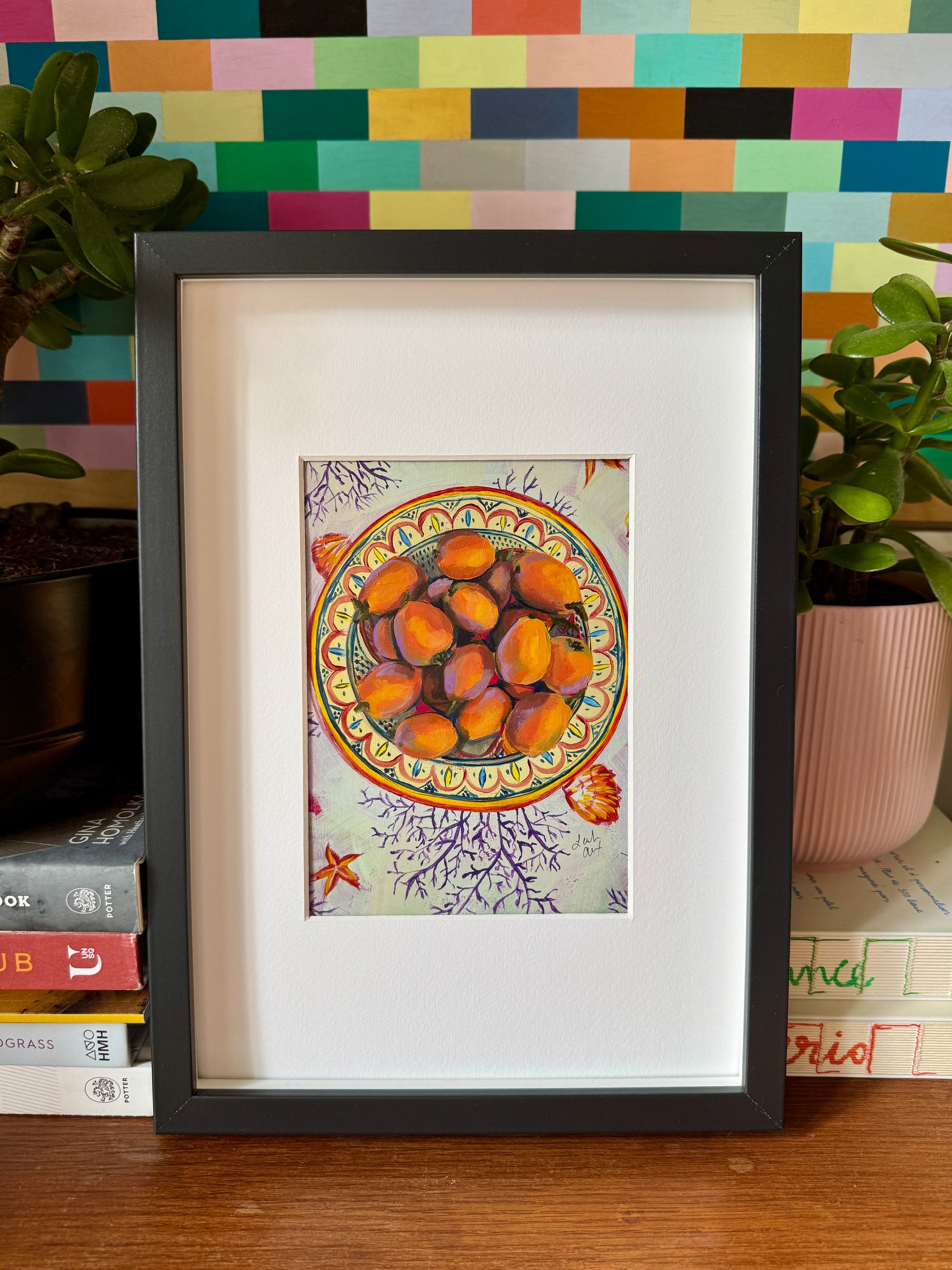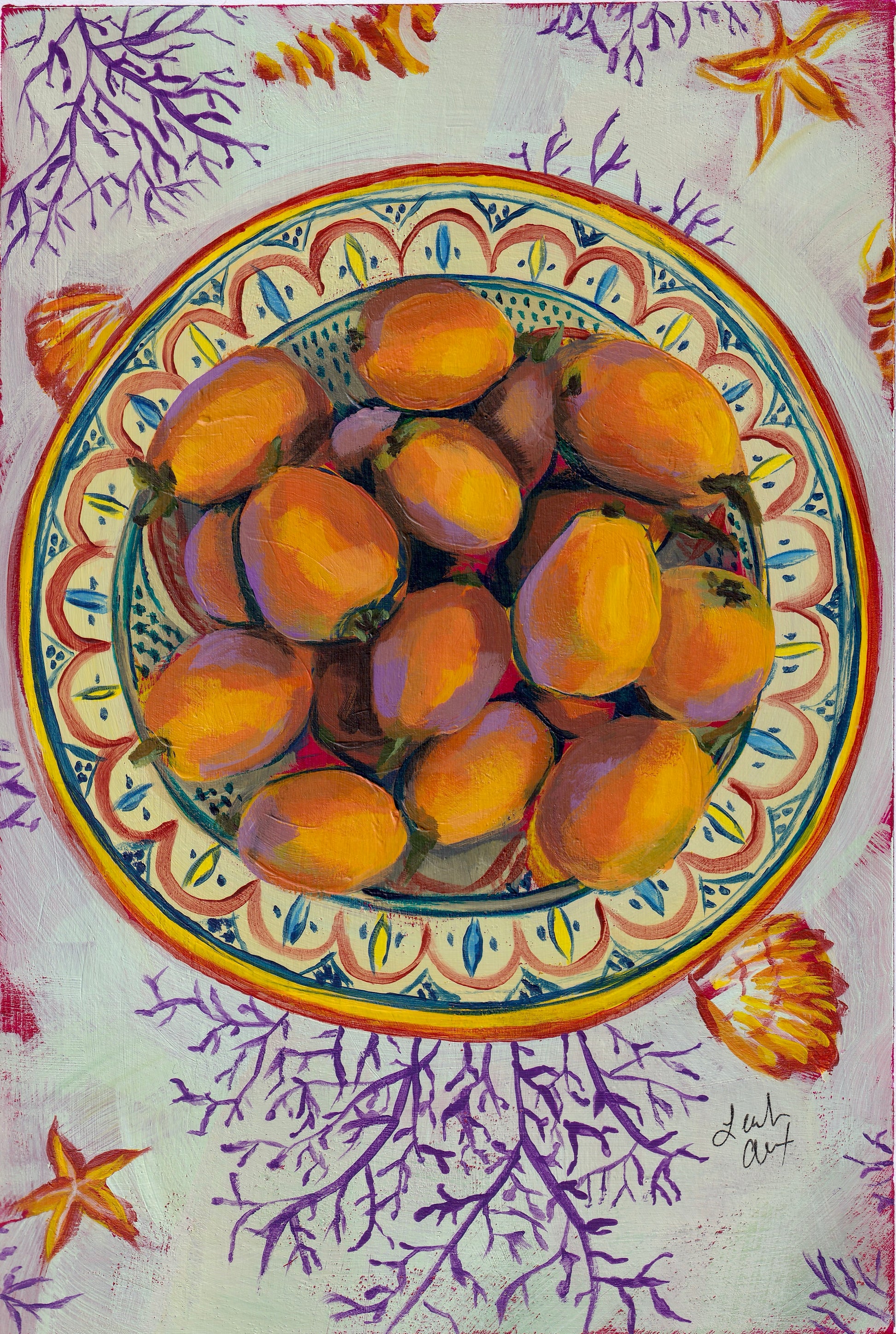 The fruit featured here is medlar, a fruit I've never tasted. It must be eaten fully matured and is uncommon to find outside of the Mediterranean.