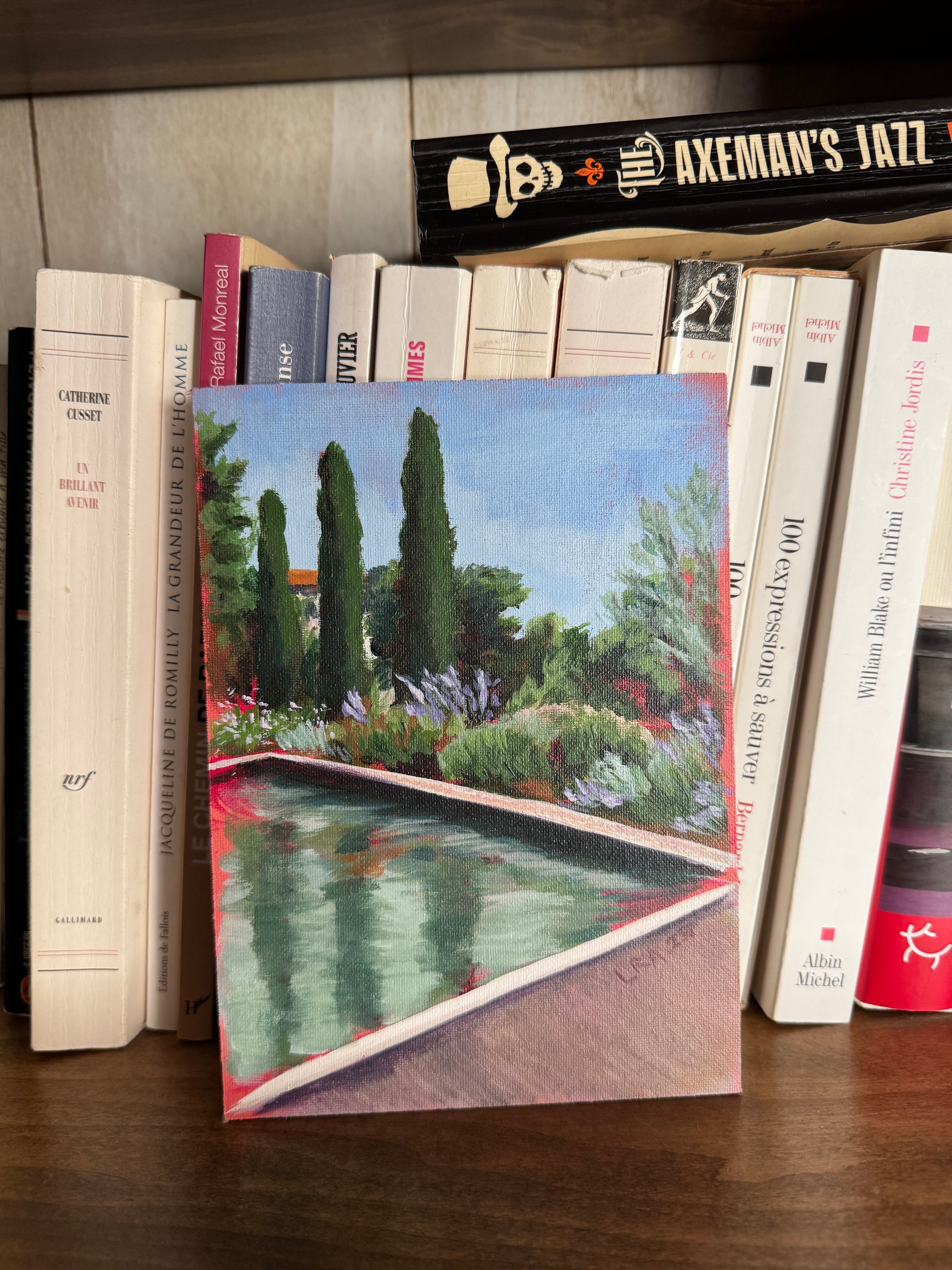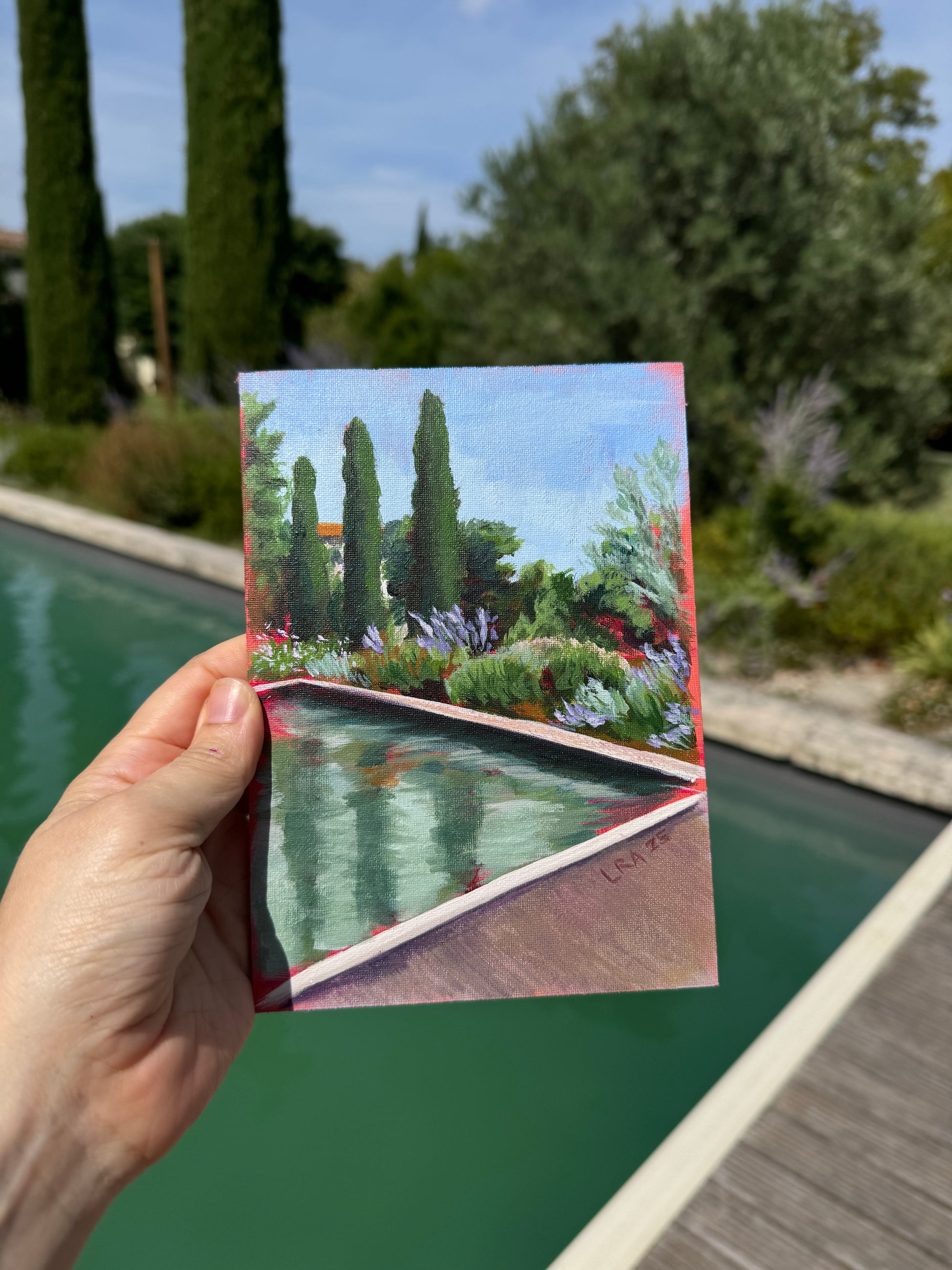 In August, Paris empties out as people retreat for days in the hot sun without the overcrowding of the city. This is where pools come in clutch. As someone who is sensitive to heat, I don't think I would last long if not for the ice cream and pools. I painted this pool from life in a quaint Provence village and dream of those lazy summer days.